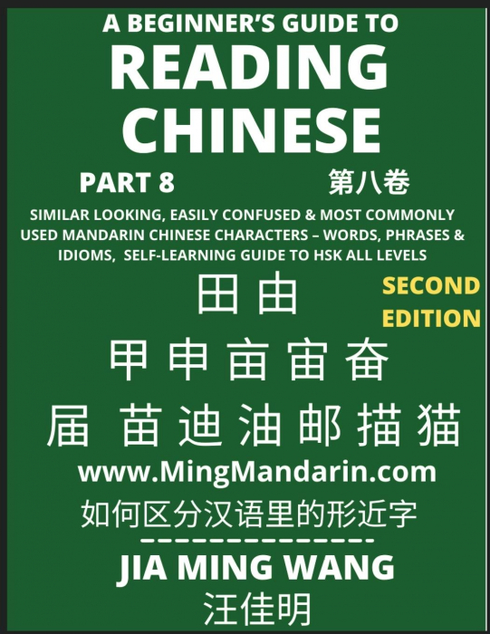The current book volume is Part 8 (¿¿¿, dì b¿ cè) of the Reading Chinese (¿¿¿¿¿¿¿¿¿¿¿, Rúhé q¿f¿n hàny¿ l¿ de xíng jìn zì) series. The books in the Reading Chinese series provide you hundreds of frequently used similar looking and easily confused (¿¿¿) common Chinese characters. For the simplicity of the readers, each volume in this series includes about 100 unique characters and nearly 500 explanatory words, phrases, and idioms. All the characters are explained with relevant words, phrases and idioms. Further, all the characters and their explanations are provided with pinyin, and English interpretations. Free online Mandarin Chinese lessons (Ming Mandarin): www.MingMandarin.com -Jia Ming
