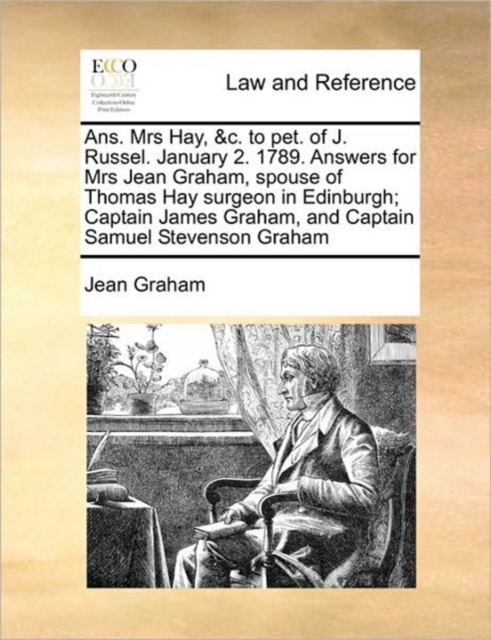 Boken Ans. Mrs Hay, &c. to Pet. of J. Russel. January 2. 1789. Answers for Mrs Jean Graham, Spouse of Thomas Hay Surgeon in Edinburgh; Captain James Graham, and Captain Samuel Stevenson Graham finnes i følgende kategorier:
