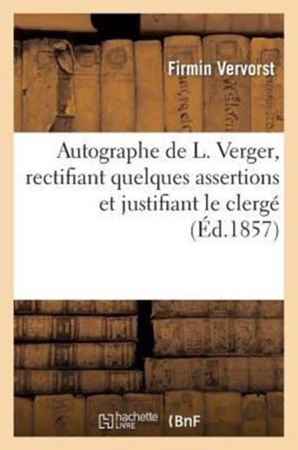 Autographe de L. Verger, rectifiant quelques assertions et justifiant le clergé . (Signé F. Vervorst.)Date de l'édition originale: 1857Sujet de l'ouvrage: VergerComprend: [Correspondance et documents inédits.]Le présent ouvrage s'inscrit dans une politique de conservation patrimoniale des ouvrages de la littérature Française mise en place avec la BNF.HACHETTE LIVRE et la BNF proposent ainsi un catalogue de titres indisponibles, la BNF ayant numérisé ces oeuvres et HACHETTE LIVRE les imprimant à la demande.Certains de ces ouvrages reflètent des courants de pensée caractéristiques de leur époque, mais qui seraient aujourd'hui jugés condamnables.Ils n'en appartiennent pas moins à l'histoire des idées en France et sont susceptibles de présenter un intérêt scientifique ou historique.Le sens de notre démarche éditoriale consiste ainsi à permettre l'accès à ces oeuvres sans pour autant que nous en cautionnions en aucune façon le contenu.Pour plus d'informations, rendez-vous sur www.hachettebnf.fr