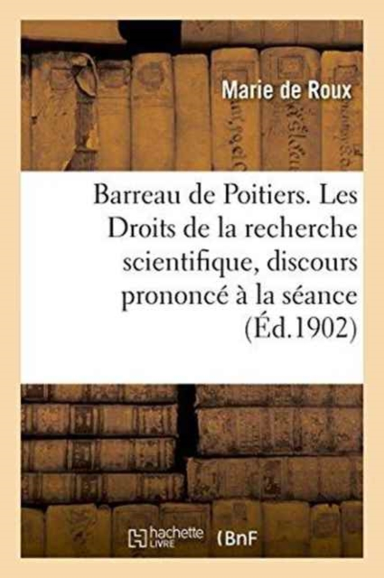 Barreau de Poitiers. Les Droits de la recherche scientifique, discours prononcé à la séance solennelle de la réouverture de la Conférence des avocats stagiaires, le 18 janvier 1902, par M. de Roux, ...Date de l'édition originale: 1902Appartient à l'ensemble documentaire: PoitouCh1Le présent ouvrage s'inscrit dans une politique de conservation patrimoniale des ouvrages de la littérature Française mise en place avec la BNF.HACHETTE LIVRE et la BNF proposent ainsi un catalogue de titres indisponibles, la BNF ayant numérisé ces oeuvres et HACHETTE LIVRE les imprimant à la demande.Certains de ces ouvrages reflètent des courants de pensée caractéristiques de leur époque, mais qui seraient aujourd'hui jugés condamnables.Ils n'en appartiennent pas moins à l'histoire des idées en France et sont susceptibles de présenter un intérêt scientifique ou historique.Le sens de notre démarche éditoriale consiste ainsi à permettre l'accès à ces oeuvres sans pour autant que nous en cautionnions en aucune façon le contenu.Pour plus d'informations, rendez-vous sur www.hachettebnf.fr
