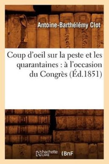 Coup d'oeil sur la peste et les quarantaines: a l'occasion du Congres sanitaire reuni a Paris au mois de juillet 1851 / par le Dr Clot-Bey, ...Date de l'edition originale: 1851Sujet de l'ouvrage: PesteQuarantaineLeproseries -- OrientCe livre est la reproduction fidele d'une oeuvre publiee avant 1920 et fait partie d'une collection de livres reimprimes a la demande editee par Hachette Livre, dans le cadre d'un partenariat avec la Bibliotheque nationale de France, offrant l'opportunite d'acceder a des ouvrages anciens et souvent rares issus des fonds patrimoniaux de la BnF.Les oeuvres faisant partie de cette collection ont ete numerisees par la BnF et sont presentes sur Gallica, sa bibliotheque numerique.En entreprenant de redonner vie a ces ouvrages au travers d'une collection de livres reimprimes a la demande, nous leur donnons la possibilite de rencontrer un public elargi et participons a la transmission de connaissances et de savoirs parfois difficilement accessibles.Nous avons cherche a concilier la reproduction fidele d'un livre ancien a partir de sa version numerisee avec le souci d'un confort de lecture optimal. Nous esperons que les ouvrages de cette nouvelle collection vous apporteront entiere satisfaction.Pour plus d'informations, rendez-vous sur www.hachettebnf.frhttp: //gallica.bnf.fr/ark: /12148/bpt6k287425