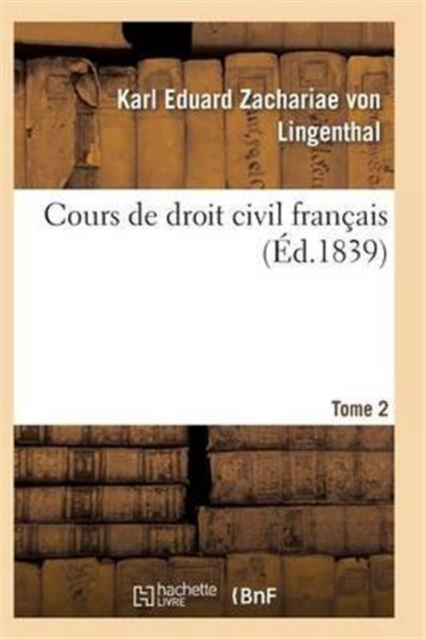 Cours de droit civil français. Tome 2 / traduit de l'allemand de M. C. S. Zachariae, ...; revu et augmenté... par M. C. Aubry, ... et M. C. Rau, ...Date de l'édition originale: 1839-1846Le présent ouvrage s'inscrit dans une politique de conservation patrimoniale des ouvrages de la littérature Française mise en place avec la BNF.HACHETTE LIVRE et la BNF proposent ainsi un catalogue de titres indisponibles, la BNF ayant numérisé ces oeuvres et HACHETTE LIVRE les imprimant à la demande.Certains de ces ouvrages reflètent des courants de pensée caractéristiques de leur époque, mais qui seraient aujourd'hui jugés condamnables.Ils n'en appartiennent pas moins à l'histoire des idées en France et sont susceptibles de présenter un intérêt scientifique ou historique.Le sens de notre démarche éditoriale consiste ainsi à permettre l'accès à ces oeuvres sans pour autant que nous en cautionnions en aucune façon le contenu.Pour plus d'informations, rendez-vous sur www.hachettebnf.fr