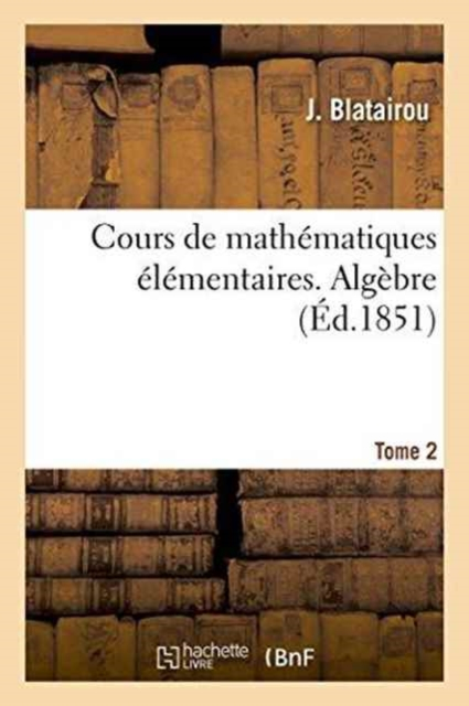 Cours de mathématiques élémentaires. II. Algèbre / par l'abbé Blatairou, ...Date de l'édition originale: 1851-1852Appartient à l'ensemble documentaire: Aquit1Le présent ouvrage s'inscrit dans une politique de conservation patrimoniale des ouvrages de la littérature Française mise en place avec la BNF.HACHETTE LIVRE et la BNF proposent ainsi un catalogue de titres indisponibles, la BNF ayant numérisé ces oeuvres et HACHETTE LIVRE les imprimant à la demande.Certains de ces ouvrages reflètent des courants de pensée caractéristiques de leur époque, mais qui seraient aujourd'hui jugés condamnables.Ils n'en appartiennent pas moins à l'histoire des idées en France et sont susceptibles de présenter un intérêt scientifique ou historique.Le sens de notre démarche éditoriale consiste ainsi à permettre l'accès à ces oeuvres sans pour autant que nous en cautionnions en aucune façon le contenu.Pour plus d'informations, rendez-vous sur www.hachettebnf.fr