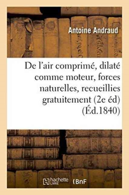 De l'air comprimé et dilaté comme moteur, ou des forces naturelles, recueillies gratuitement et mises en réserve (2e édition augmentée d'une partie expérimentale) / par M. AndraudDate de l'édition originale: 1840Le présent ouvrage s'inscrit dans une politique de conservation patrimoniale des ouvrages de la littérature Française mise en place avec la BNF.HACHETTE LIVRE et la BNF proposent ainsi un catalogue de titres indisponibles, la BNF ayant numérisé ces oeuvres et HACHETTE LIVRE les imprimant à la demande.Certains de ces ouvrages reflètent des courants de pensée caractéristiques de leur époque, mais qui seraient aujourd'hui jugés condamnables.Ils n'en appartiennent pas moins à l'histoire des idées en France et sont susceptibles de présenter un intérêt scientifique ou historique.Le sens de notre démarche éditoriale consiste ainsi à permettre l'accès à ces oeuvres sans pour autant que nous en cautionnions en aucune façon le contenu.Pour plus d'informations, rendez-vous sur www.hachettebnf.fr