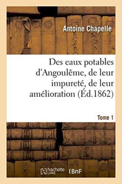 Des eaux potables d'Angoulême, de leur impureté, de leur amélioration. 1 / par M. le Dr A. Chapelle, ...Date de l'édition originale: 1862-1863Appartient à l'ensemble documentaire: PoitouCh1Le présent ouvrage s'inscrit dans une politique de conservation patrimoniale des ouvrages de la littérature Française mise en place avec la BNF.HACHETTE LIVRE et la BNF proposent ainsi un catalogue de titres indisponibles, la BNF ayant numérisé ces oeuvres et HACHETTE LIVRE les imprimant à la demande.Certains de ces ouvrages reflètent des courants de pensée caractéristiques de leur époque, mais qui seraient aujourd'hui jugés condamnables.Ils n'en appartiennent pas moins à l'histoire des idées en France et sont susceptibles de présenter un intérêt scientifique ou historique.Le sens de notre démarche éditoriale consiste ainsi à permettre l'accès à ces oeuvres sans pour autant que nous en cautionnions en aucune façon le contenu.Pour plus d'informations, rendez-vous sur www.hachettebnf.fr