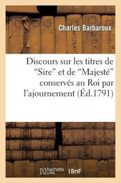 Discours sur les titres de "Sire" et de "Majesté" conservés au Roi par l'ajournement du décret du 5 octobre 1791: prononcé dans la Société des amis de la Constitution de Marseille le 16 octobre, l'an troisième de la liberté / par M. Barbaroux, homme de loiDate de l'édition originale: 1791Le présent ouvrage s'inscrit dans une politique de conservation patrimoniale des ouvrages de la littérature Française mise en place avec la BNF.HACHETTE LIVRE et la BNF proposent ainsi un catalogue de titres indisponibles, la BNF ayant numérisé ces oeuvres et HACHETTE LIVRE les imprimant à la demande.Certains de ces ouvrages reflètent des courants de pensée caractéristiques de leur époque, mais qui seraient aujourd'hui jugés condamnables.Ils n'en appartiennent pas moins à l'histoire des idées en France et sont susceptibles de présenter un intérêt scientifique ou historique.Le sens de notre démarche éditoriale consiste ainsi à permettre l'accès à ces oeuvres sans pour autant que nous en cautionnions en aucune façon le contenu.Pour plus d'informations, rendez-vous sur www.hachettebnf.fr