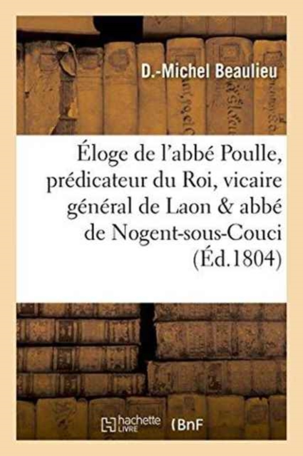 Éloge de l'abbé Poulle, prédicateur du Roi, vicaire général de Laon et abbé commandataire de Nogent-sous-Couci, faisant partie des ouvrages lus à la séance publique de l'Athénée de Vaucluse, du 2 brumaire an XII, par D.-Michel Beaulieu, ...Date de l'édition originale: 1804Appartient à l'ensemble documentaire: Picardi1Appartient à l'ensemble documentaire: PACA1Le présent ouvrage s'inscrit dans une politique de conservation patrimoniale des ouvrages de la littérature Française mise en place avec la BNF.HACHETTE LIVRE et la BNF proposent ainsi un catalogue de titres indisponibles, la BNF ayant numérisé ces oeuvres et HACHETTE LIVRE les imprimant à la demande.Certains de ces ouvrages reflètent des courants de pensée caractéristiques de leur époque, mais qui seraient aujourd'hui jugés condamnables.Ils n'en appartiennent pas moins à l'histoire des idées en France et sont susceptibles de présenter un intérêt scientifique ou historique.Le sens de notre démarche éditoriale consiste ainsi à permettre l'accès à ces oeuvres sans pour autant que nous en cautionnions en aucune façon le contenu.Pour plus d'informations, rendez-vous sur www.hachettebnf.fr
