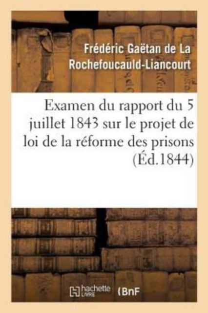 Examen du rapport du 5 juillet 1843 sur le projet de loi de la réforme des prisons / [signé La Rochefoucauld-Liancourt]Date de l'édition originale: 1844Le présent ouvrage s'inscrit dans une politique de conservation patrimoniale des ouvrages de la littérature Française mise en place avec la BNF.HACHETTE LIVRE et la BNF proposent ainsi un catalogue de titres indisponibles, la BNF ayant numérisé ces oeuvres et HACHETTE LIVRE les imprimant à la demande.Certains de ces ouvrages reflètent des courants de pensée caractéristiques de leur époque, mais qui seraient aujourd'hui jugés condamnables.Ils n'en appartiennent pas moins à l'histoire des idées en France et sont susceptibles de présenter un intérêt scientifique ou historique.Le sens de notre démarche éditoriale consiste ainsi à permettre l'accès à ces oeuvres sans pour autant que nous en cautionnions en aucune façon le contenu.Pour plus d'informations, rendez-vous sur www.hachettebnf.fr