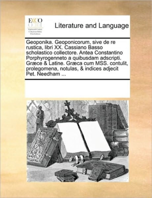 Geoponika. Geoponicorum, Sive de Re Rustica, Libri XX. Cassiano Basso Scholastico Collectore. Antea Constantino Porphyrogenneto a Quibusdam Adscripti. Graece & Latine. Graeca Cum Mss. Contulit, Prolegomena, Notulas, & Indices Adjecit Pet. Needham ...