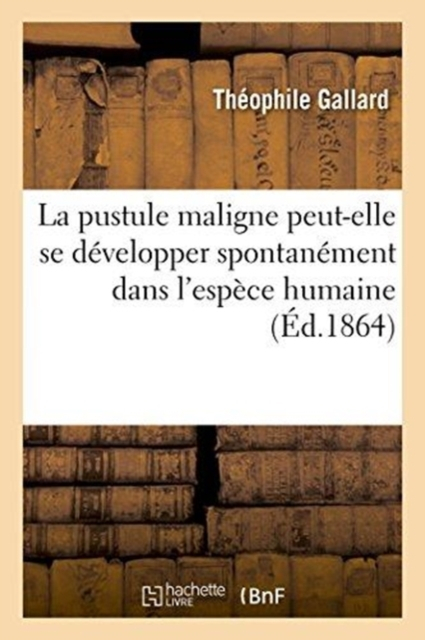 La pustule maligne peut-elle se développer spontanément dans l'espèce humaine / par T. Gallard, ...; rapport de M. Gosselin; Académie impériale de médecine.Date de l'édition originale: 1864Le présent ouvrage s'inscrit dans une politique de conservation patrimoniale des ouvrages de la littérature Française mise en place avec la BNF.HACHETTE LIVRE et la BNF proposent ainsi un catalogue de titres indisponibles, la BNF ayant numérisé ces oeuvres et HACHETTE LIVRE les imprimant à la demande.Certains de ces ouvrages reflètent des courants de pensée caractéristiques de leur époque, mais qui seraient aujourd'hui jugés condamnables.Ils n'en appartiennent pas moins à l'histoire des idées en France et sont susceptibles de présenter un intérêt scientifique ou historique.Le sens de notre démarche éditoriale consiste ainsi à permettre l'accès à ces oeuvres sans pour autant que nous en cautionnions en aucune façon le contenu.Pour plus d'informations, rendez-vous sur www.hachettebnf.fr
