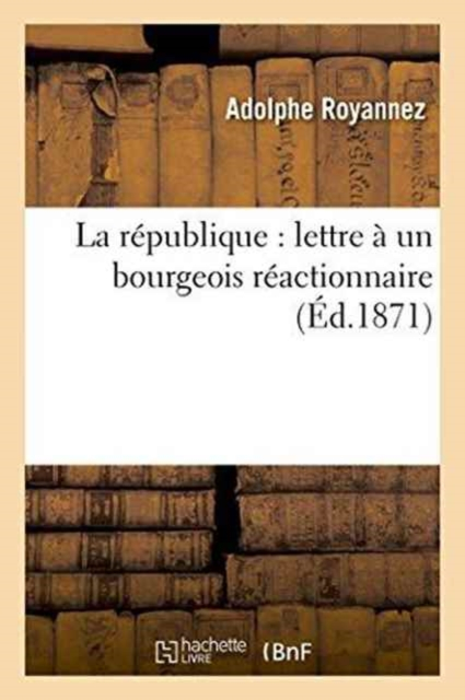 La république: lettre à un bourgeois réactionnaire / par Adolphe RoyannezDate de l'édition originale: 1871Appartient à l'ensemble documentaire: PACA1Le présent ouvrage s'inscrit dans une politique de conservation patrimoniale des ouvrages de la littérature Française mise en place avec la BNF.HACHETTE LIVRE et la BNF proposent ainsi un catalogue de titres indisponibles, la BNF ayant numérisé ces oeuvres et HACHETTE LIVRE les imprimant à la demande.Certains de ces ouvrages reflètent des courants de pensée caractéristiques de leur époque, mais qui seraient aujourd'hui jugés condamnables.Ils n'en appartiennent pas moins à l'histoire des idées en France et sont susceptibles de présenter un intérêt scientifique ou historique.Le sens de notre démarche éditoriale consiste ainsi à permettre l'accès à ces oeuvres sans pour autant que nous en cautionnions en aucune façon le contenu.Pour plus d'informations, rendez-vous sur www.hachettebnf.fr