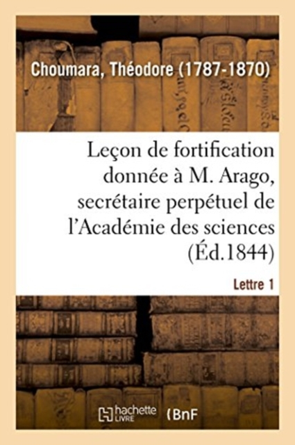 Leçon de fortification donnée à M. Arago, secrétaire perpétuel de l'Académie des sciences, par le chef de bataillon du génie T. Choumara, pour servir de réponse aux lettres de M. Arago sur les fortifications de Paris. 1re lettre ou leçon préparatoireDate de l'édition originale: 1844Le présent ouvrage s'inscrit dans une politique de conservation patrimoniale des ouvrages de la littérature Française mise en place avec la BNF. HACHETTE LIVRE et la BNF proposent ainsi un catalogue de titres indisponibles, la BNF ayant numérisé ces oeuvres et HACHETTE LIVRE les imprimant à la demande. Certains de ces ouvrages reflètent des courants de pensée caractéristiques de leur époque, mais qui seraient aujourd'hui jugés condamnables. Ils n'en appartiennent pas moins à l'histoire des idées en France et sont susceptibles de présenter un intérêt scientifique ou historique. Le sens de notre démarche éditoriale consiste ainsi à permettre l'accès à ces oeuvres sans pour autant que nous en cautionnions en aucune façon le contenu. Pour plus d'informations, rendez-vous sur www.hachettebnf.fr