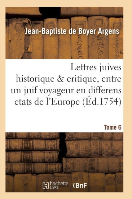 Lettres juives, ou Correspondance philosophique, historique & critique, entre un juif voyageur en differens etats de l'Europe, & ses correspondans en divers endroits. Tome 6 / . Nouvelle edition, augmentée de nouvelles lettres & de quantité de remarques. Tome premier [-huitieme]Date de l'édition originale: 1754Le présent ouvrage s'inscrit dans une politique de conservation patrimoniale des ouvrages de la littérature Française mise en place avec la BNF.HACHETTE LIVRE et la BNF proposent ainsi un catalogue de titres indisponibles, la BNF ayant numérisé ces oeuvres et HACHETTE LIVRE les imprimant à la demande.Certains de ces ouvrages reflètent des courants de pensée caractéristiques de leur époque, mais qui seraient aujourd'hui jugés condamnables.Ils n'en appartiennent pas moins à l'histoire des idées en France et sont susceptibles de présenter un intérêt scientifique ou historique.Le sens de notre démarche éditoriale consiste ainsi à permettre l'accès à ces oeuvres sans pour autant que nous en cautionnions en aucune façon le contenu.Pour plus d'informations, rendez-vous sur www.hachettebnf.fr