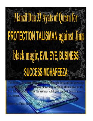 Manzil Dua 33 Ayats of Quran for PROTECTION TALISMAN against Jinn black magic, EVIL EYE, BUSINESS SUCCESS MOHAFEEZA.The Manzil comprises the following verses of the Quran: Surah Al-Fatihah (chapter 1): verses 1 to 7 Surah Al-Bakarah (chapter 2): verses 1 to 5, 163, 255 to 257, and 284 to 286 Surah Al-Imran (chapter 3): verses 18, 26 and 27 Surah Al-A'araf (chapter 7): verses 54 to 56 Surah Al-Israa (chapter 17): verses 110 and 111 Surah Al-Muminoon (chapter 23): verses 115 to 118 Surah Al-Saaffaat (chapter 37): verses 1 to 11 Surah Al-Rehman (chapter 55): verses 33 to 40 Surah Al-Hashr (chapter 59): verses 21 to 24 Surah Al-Jinn (chapter 72): verses 1 to 4 Surah Al-Kaafiroon (chapter 109): verses 1 to 6 Surah Al-Ikhlas (chapter 112): verses 1 to 4 Surah Al-Falaq (chapter 113): verses 1 to 5 Surah Al-Naas (chapter 114): verses 1 to 6 This book also includes Surah Yaseen and Surah Al-Waqi'ah. It also describes the benefits of the surahs from Quran and Hadiths. It also has the list of 99 names of Allah with definition and benefits.