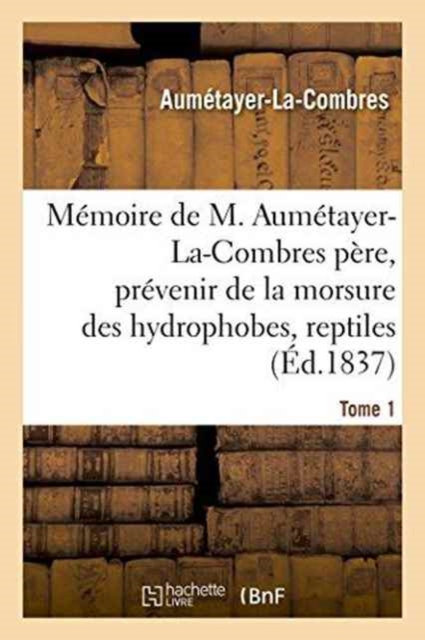 Mémoire de M. Aumétayer-La-Combres père, ... sur l'art précieux de prévenir les accidents fâcheux qui résultent de la morsure des êtres hydrophobes et des reptiles en général, du charbon noir, des coliques, des dartres, des cancers, des plaies et des coupures. Numéro 1 / rédigé par M. A. Aumétayer fils, ...Date de l'édition originale: 1837Appartient à l'ensemble documentaire: LangRous1Le présent ouvrage s'inscrit dans une politique de conservation patrimoniale des ouvrages de la littérature Française mise en place avec la BNF.HACHETTE LIVRE et la BNF proposent ainsi un catalogue de titres indisponibles, la BNF ayant numérisé ces oeuvres et HACHETTE LIVRE les imprimant à la demande.Certains de ces ouvrages reflètent des courants de pensée caractéristiques de leur époque, mais qui seraient aujourd'hui jugés condamnables.Ils n'en appartiennent pas moins à l'histoire des idées en France et sont susceptibles de présenter un intérêt scientifique ou historique.Le sens de notre démarche éditoriale consiste ainsi à permettre l'accès à ces oeuvres sans pour autant que nous en cautionnions en aucune façon le contenu.Pour plus d'informations, rendez-vous sur www.hachettebnf.fr