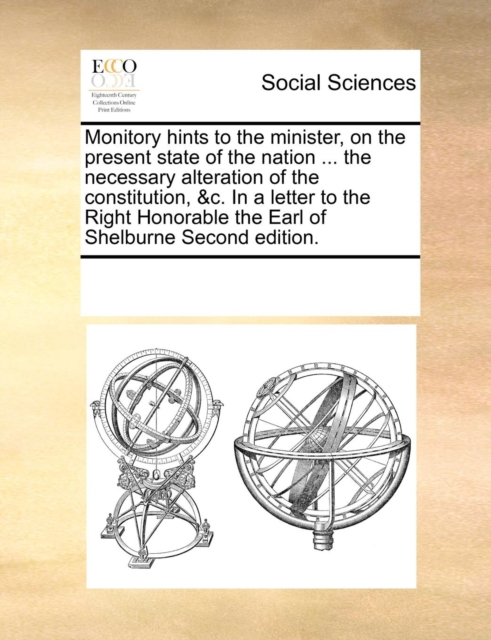 Boken Monitory Hints to the Minister, on the Present State of the Nation ... the Necessary Alteration of the Constitution, &c. in a Letter to the Right Honorable the Earl of Shelburne Second Edition. finnes i følgende kategorier:
