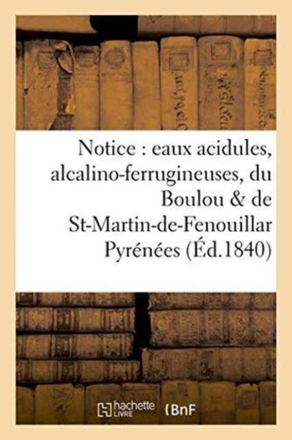 Notice sur les eaux acidules, alcalino-ferrugineuses, du Boulou, et de Saint-Martin-de-[...] (Pyrénées-Orientales), prise sur le traité des eaux minérales des Pyrénées-Orientales [1833]; par [...] Anglada, ... et sur une nouvelle analyse de ces eaux faite, le 26 avril 1840; par M. Bérard, ...Date de l'édition originale: 1840Appartient à l'ensemble documentaire: LangRous1Le présent ouvrage s'inscrit dans une politique de conservation patrimoniale des ouvrages de la littérature Française mise en place avec la BNF.HACHETTE LIVRE et la BNF proposent ainsi un catalogue de titres indisponibles, la BNF ayant numérisé ces oeuvres et HACHETTE LIVRE les imprimant à la demande.Certains de ces ouvrages reflètent des courants de pensée caractéristiques de leur époque, mais qui seraient aujourd'hui jugés condamnables.Ils n'en appartiennent pas moins à l'histoire des idées en France et sont susceptibles de présenter un intérêt scientifique ou historique.Le sens de notre démarche éditoriale consiste ainsi à permettre l'accès à ces oeuvres sans pour autant que nous en cautionnions en aucune façon le contenu.Pour plus d'informations, rendez-vous sur www.hachettebnf.fr