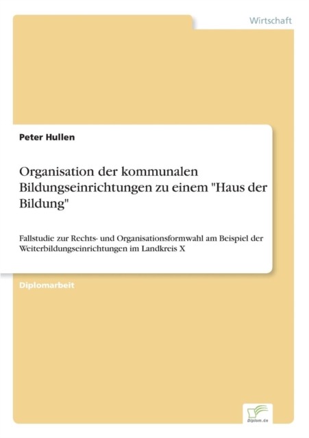 Nach Prüfung der rechtlichen Voraussetzungen sowie mittels sachlicher Einengung auf die entscheidungsrelevanten Rechtsformen kommen der Zweckverband, die GmbH und der Verein als zu untersuchende Organisationsformen in die engere Auswahl. Für sie wird eine Rechtsformenanalyse und eine sachgerechte Ermessensausübung anhand von Entscheidungskriterien vollzogen. Zum Abschluss erfolgt unter Berücksichtigung der zu erfüllenden Aufgabenbereiche und der Organisationsziele ein Bewertungsverfahren mit Hilfe einer Nutzwertanalyse. Im Ergebnis wird die optimalste und vorteilhafteste Rechtsform für das ?Haus der Bildung? herausgestellt.