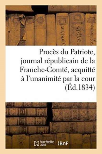 Procès du "Patriote", journal républicain de la Franche-Comté, acquitté à l'unanimité par la cour d'assises du département du Doubs, le 20 janvier 1834Date de l'édition originale: 1834Sujet de l'ouvrage: France (1830-1848, Louis-Philippe)Appartient à l'ensemble documentaire: FrancComt1Le présent ouvrage s'inscrit dans une politique de conservation patrimoniale des ouvrages de la littérature Française mise en place avec la BNF.HACHETTE LIVRE et la BNF proposent ainsi un catalogue de titres indisponibles, la BNF ayant numérisé ces oeuvres et HACHETTE LIVRE les imprimant à la demande.Certains de ces ouvrages reflètent des courants de pensée caractéristiques de leur époque, mais qui seraient aujourd'hui jugés condamnables.Ils n'en appartiennent pas moins à l'histoire des idées en France et sont susceptibles de présenter un intérêt scientifique ou historique.Le sens de notre démarche éditoriale consiste ainsi à permettre l'accès à ces oeuvres sans pour autant que nous en cautionnions en aucune façon le contenu.Pour plus d'informations, rendez-vous sur www.hachettebnf.fr