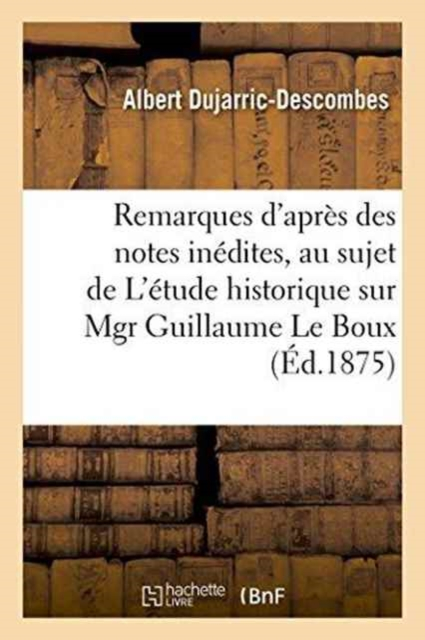 Remarques d'après des notes inédites, au sujet de L'étude historique sur Mgr Guillaume Le Boux, évêque de Périgueux et prédicateur ordinaire de Louis XIV, par l'abbé E. Riboulet / A. Dujarric-DescombesDate de l'édition originale: 1875Sujet de l'ouvrage: Le Boux, Guil.Appartient à l'ensemble documentaire: Aquit1Le présent ouvrage s'inscrit dans une politique de conservation patrimoniale des ouvrages de la littérature Française mise en place avec la BNF.HACHETTE LIVRE et la BNF proposent ainsi un catalogue de titres indisponibles, la BNF ayant numérisé ces oeuvres et HACHETTE LIVRE les imprimant à la demande.Certains de ces ouvrages reflètent des courants de pensée caractéristiques de leur époque, mais qui seraient aujourd'hui jugés condamnables.Ils n'en appartiennent pas moins à l'histoire des idées en France et sont susceptibles de présenter un intérêt scientifique ou historique.Le sens de notre démarche éditoriale consiste ainsi à permettre l'accès à ces oeuvres sans pour autant que nous en cautionnions en aucune façon le contenu.Pour plus d'informations, rendez-vous sur www.hachettebnf.fr