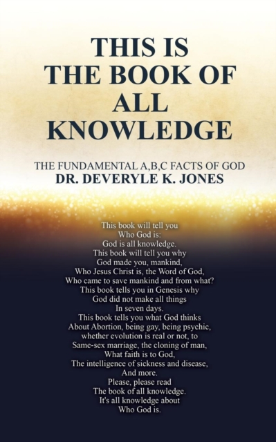 Dr. Deveryle K. Jones born and raised in Los Angeles, California by his wonderful motherwho push his life to discover the knowledge ofThe Word of God so has been a member ofCrenshaw Christian Center in Los Angeles since 1973.In studying the definition of knowledge for years.I have discover the facts ofALL KNOWLEDGE MUST EXIST And in the BibleALL KNOWLEDGE IS GOD.So in my book is my calling To teach millions of Christians and all todaythe Step-by-step fundermental understanding ofWho is GOD to who is Jesus Christ The Word of God to make all things madeGod said.Find outWho are we mankind on earth for what?Why Jesus Christ had to come save mankind and from what?Find out in this bookThe real facts of God about evolution, or being psychic orbeingGay, same sex marriage, abortion, human cloning, stem cells,sickness and disease, what are ghosts, the right church to go and more. So please read this book again and againSo you can grow to know God and his word Jesus Christso you can save yourself, family and others to go be with the fatherWho is All Knowledge God.
