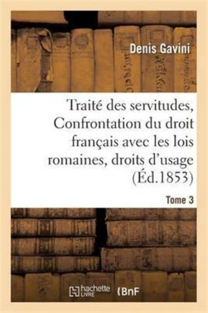 Traité des servitudes, ou Confrontation du droit français avec les lois romaines concernant les droits d'usage et les services fonciers. Tome 3 / par M. Gavini de Campile, ...Date de l'édition originale: 1853-1869Le présent ouvrage s'inscrit dans une politique de conservation patrimoniale des ouvrages de la littérature Française mise en place avec la BNF.HACHETTE LIVRE et la BNF proposent ainsi un catalogue de titres indisponibles, la BNF ayant numérisé ces oeuvres et HACHETTE LIVRE les imprimant à la demande.Certains de ces ouvrages reflètent des courants de pensée caractéristiques de leur époque, mais qui seraient aujourd'hui jugés condamnables.Ils n'en appartiennent pas moins à l'histoire des idées en France et sont susceptibles de présenter un intérêt scientifique ou historique.Le sens de notre démarche éditoriale consiste ainsi à permettre l'accès à ces oeuvres sans pour autant que nous en cautionnions en aucune façon le contenu.Pour plus d'informations, rendez-vous sur www.hachettebnf.fr