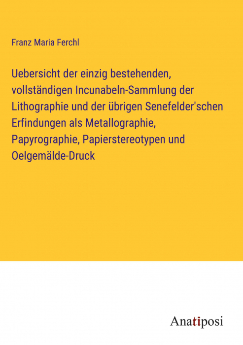 Uebersicht der einzig bestehenden, vollständigen Incunabeln-Sammlung der Lithographie und der übrigen Senefelder'schen Erfindungen als Metallographie, Papyrographie, Papierstereotypen und Oelgemälde-Druck